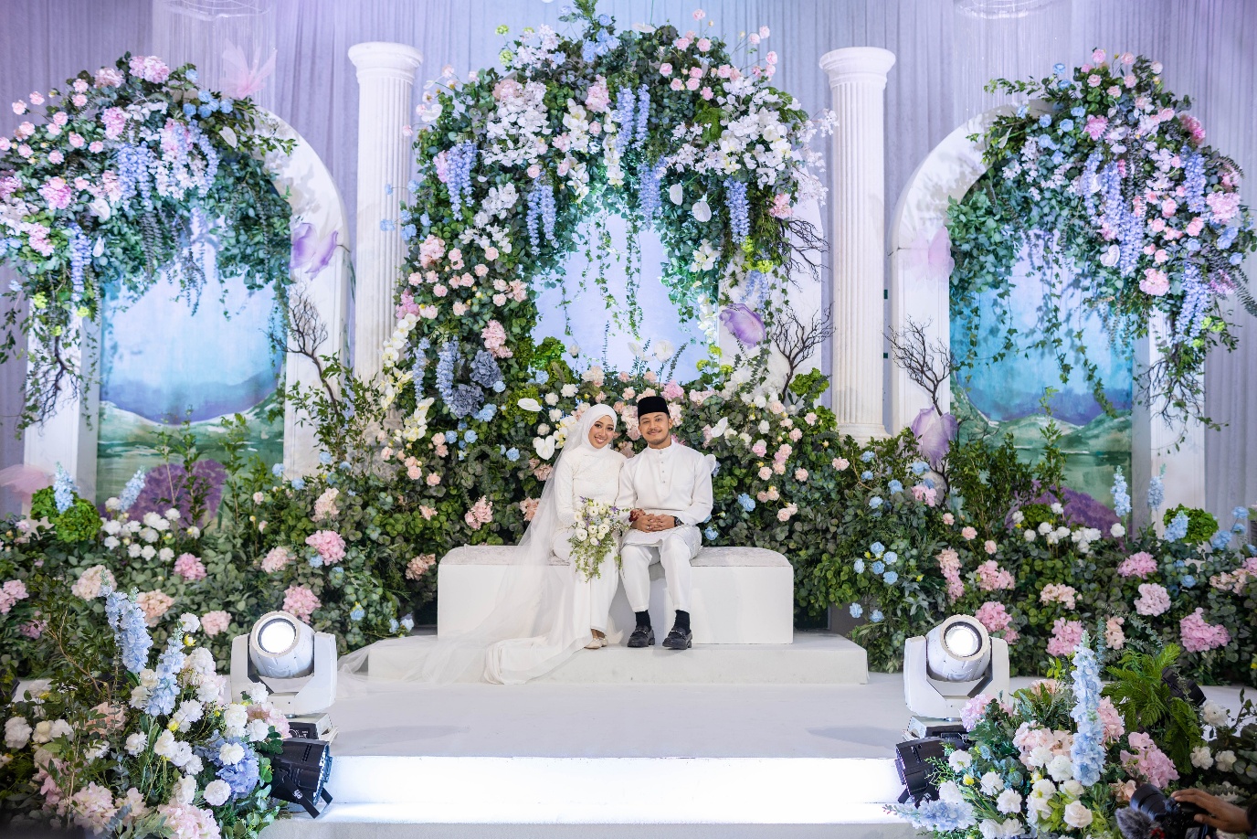 Tepat jam 12.30pm, kedua pasangan mempelai ini hadir di bawah pintu gerbang utama, menanti untuk kemasukkan kedalam dewan VillaBusainna. Selawat Taslim didendangkan semasa pasangan mempelai ini berada di bawah pintu gerbang majlis, sebelum mereka berjalan memasuki dewan menuju ke pelamin idaman mereka. Selawat ini didendangkan bagi memberkati majlis perkahwinan mereka dan memberkati hubungan pasangan pengantin ini menempuh kehidupan sebagai suami isteri. Habis sahaja dedangan selawat Taslim, pengacara majlis mengumumkan kemasukkan pasangan dengan lagu pilihan mereka untuk berjalan memasuki dewan menuju ke pelamin. Pelamin yang bertemakan alam fauna yang berlangit biru cerah dengan gubahan dedaun dan dicantikkan lagi dengan gubahan bunga berwarna biru dan ungu pastel. Struktur 2 tiang megah seperti tiang di zaman Yunani dan berlatarkan lukisan abstrak langit biru. Pelamin mereka ini kelihatan sunggah megah dan cantik kerana gabungan struktur, lukisan abstrak dan gubahan bunga dari team deco Villa Busainna yang berpengalaman. Pengacara majlis memulakan majlis dengan bacaan doa dan kata-kata aluan sebelum meneruskan majlis dengan sesi salam restu. Salam restu daripada ibunda dan ayahanda kepada dijalankan di atas pelaminan dan diteruskan dengan fotografi untuk mengabadikan memori indah ini. seterusnya mereka meneruskan majlis dengan sesi makan beradap dan sesi memotong kek perkahwinan mereka.